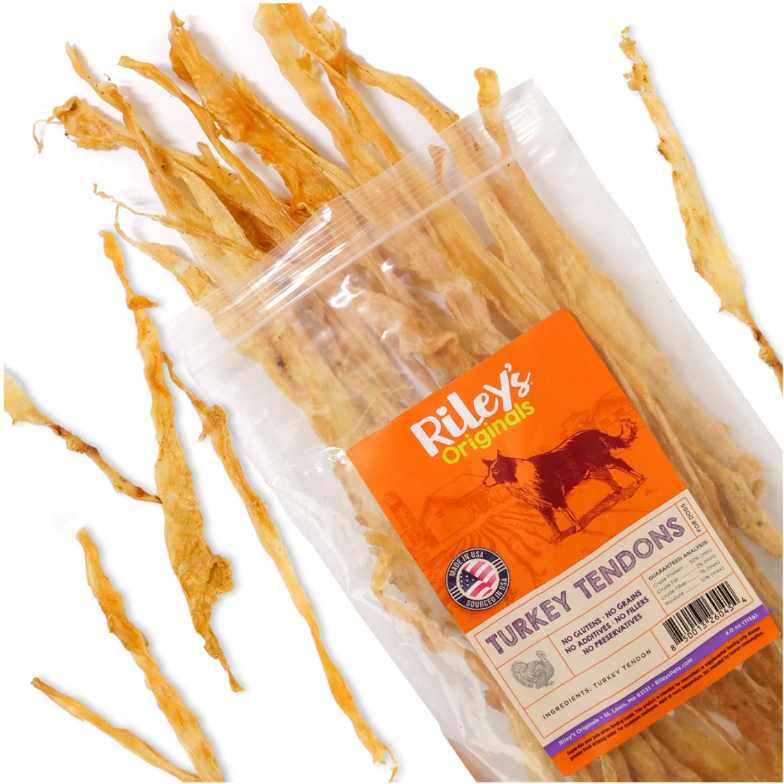 Riley's USA-Made Turkey Tendons for Dogs are premium dog chews that are sourced and made in the USA, specifically in Colorado, ensuring the highest quality and safety for your furry friend. Made with only a single ingredient - dehydrated turkey tendons - these dog chews are all-natural with no additives or artificial preservatives. Riley's Turkey Tendons are packed with protein, making them a healthy and nutritious treat for dogs of all sizes and breeds. They are also great for dental health, as they help clean teeth and gums while satisfying your dog's natural urge to chew. Our turkey tendons are carefully dehydrated to retain their natural flavors, resulting in a tasty treat that dogs love. They are perfect for training and rewarding good behavior, as well as for simply indulging your dog with a delicious and wholesome snack. Try Riley's USA-Made Turkey Tendons for Dogs as a high-quality, single-ingredient dog chew that you can trust. Your furry friend will thank you for the tasty and satisfying treat! Each pack contains 4 oz of premium turkey tendons, providing plenty of chews to keep your pup happy and healthy.
