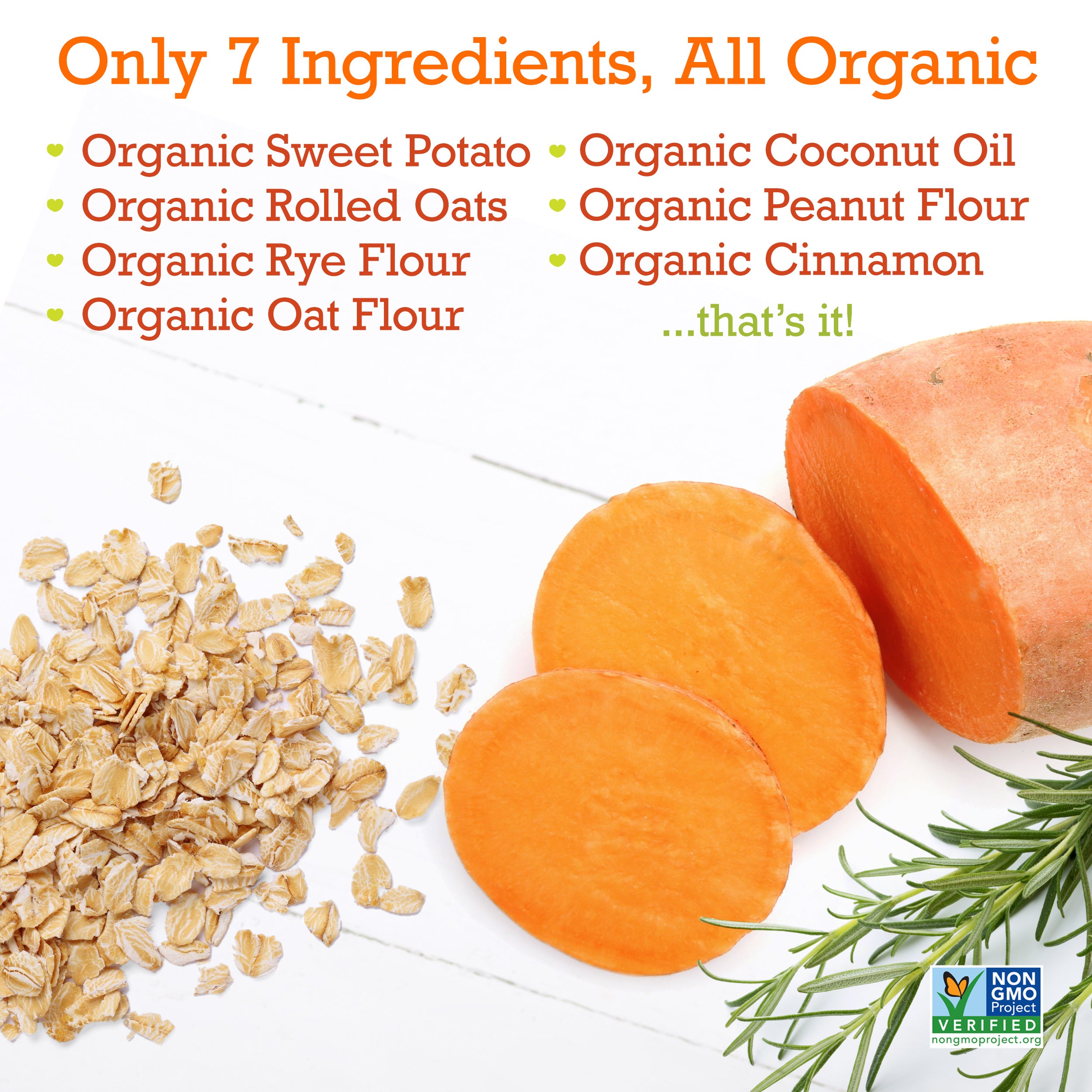 Ingredients: Organic Sweet Potato, Organic Rolled Oats, Organic Rye Flour, Organic Oat Flour, Organic Coconut Oil, Organic Peanut Flour, Organic Cinnamon