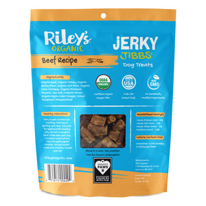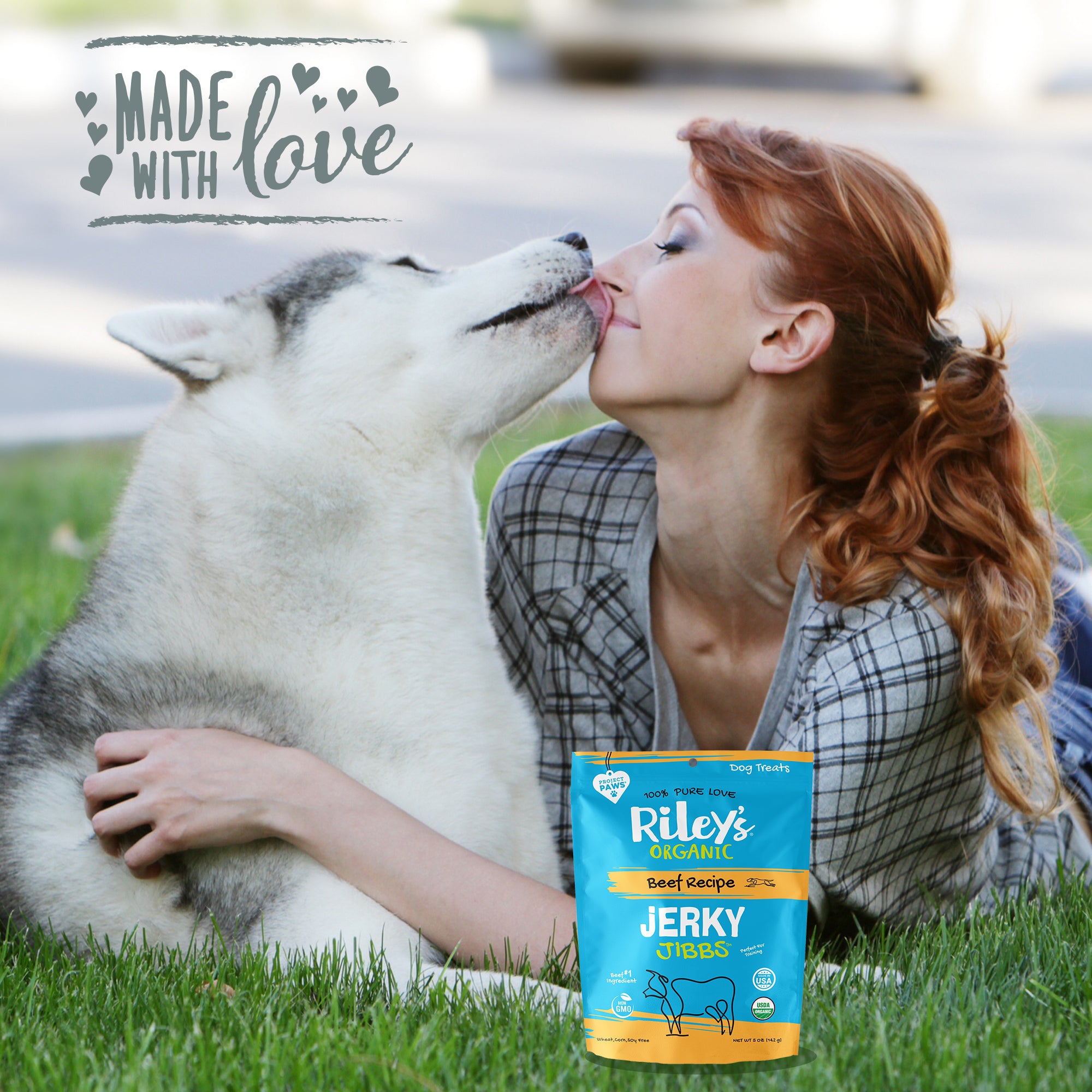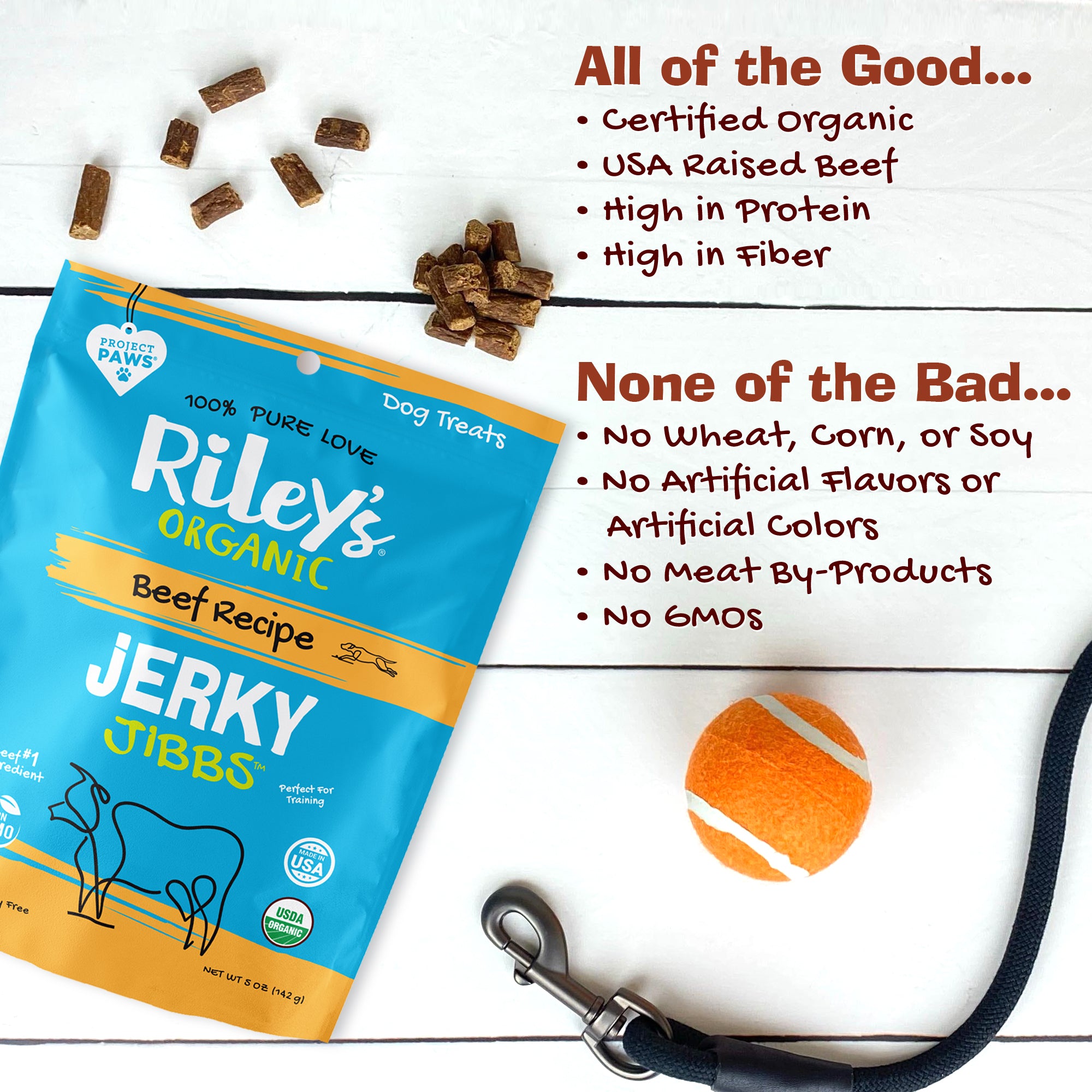 Riley's Organic Beef Jerky Jibbs are the perfect way to return the love your dog gives you every day. Certified Organic, Jibbs are low in calories and perfect for training. These delicious treats are given a four-paws vote of approval by dogs of all sizes. When you want to give your best friend the very best, make it Riley's.