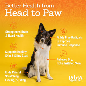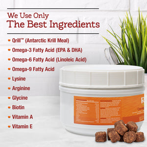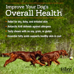 Riley's Essentials Omega 3-6-9 Complete soft chews for dogs are a high-potency formula containing Antarctic Krill, a blend of three fatty acids (Omega 3,6,9), super antioxidant Astaxanthin, and Vitamins A, E, and Biotin.